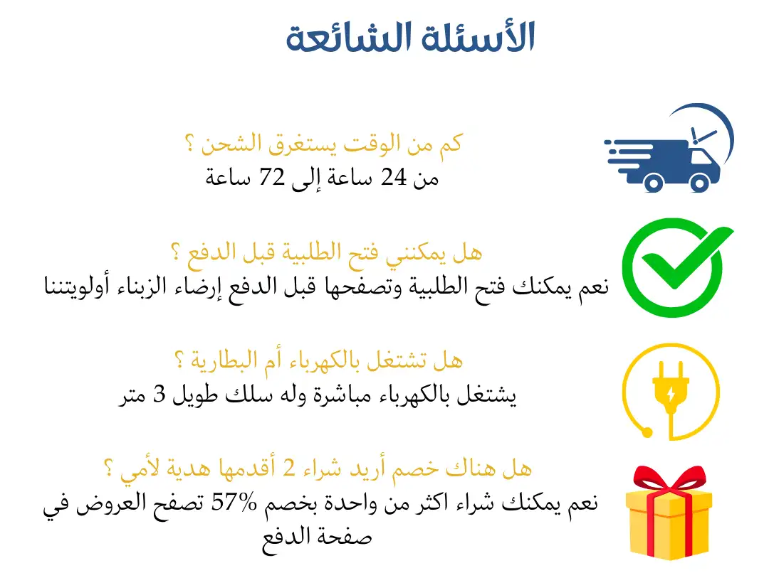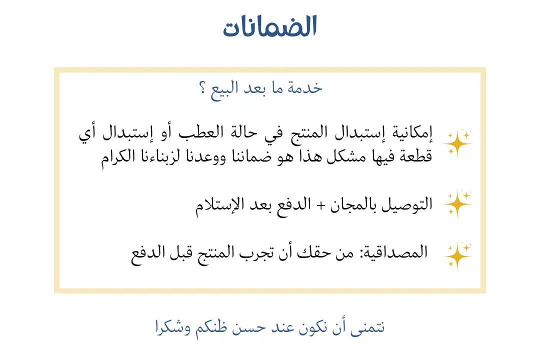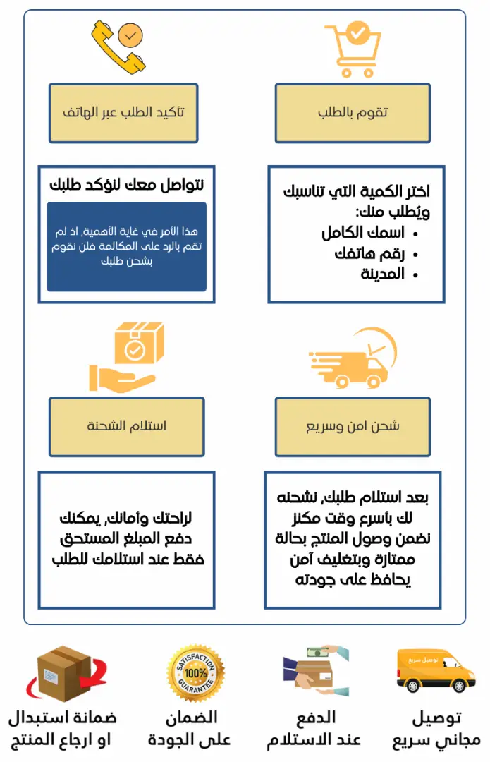 الدفع عند الاستلام مدعوم لهدا المنتج، ستحتاج للإدلاء بعنوانك و معلومات الاتصال بك وكدا طريقة الدفع لتأكيد الطلب ثم سيتم ربط الاتصال بك عبر مكالمة هاتفية لتأكيد طلبك، بعد التأكد من الطلب سيتم الشحن في غضون 1-3 أيام عمل.